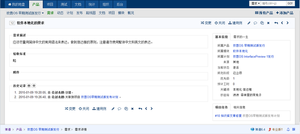 开源社区的软件作品,大多并无商业利益的关联。同时大多数开源项目参与度也并非很高,提出的需求大部分来自社区成员内部和爱好者的日常使用。从这点看来,我们既是开发成员又是客户,虽然是自己给自己提需求,这一步也是绝对不能省略的,在脑海中时常会显示灵光一现的想法,最好能及时做记录,分类后提交到项目管理系统的需求管理处,方便日后开发时整理。提需求时可以参考如下格式: