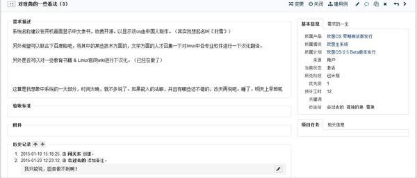 如上图,第一个画面为社区成员提出的需求,第二个画面为爱好者对玟茵系统提出的一些意见,这里也暂时整理为需求。不过融入产品迭代中。这类型需求还需要进行细分。