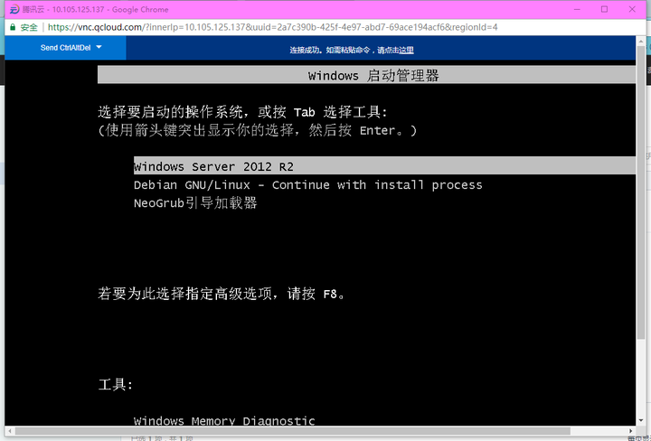 下面重新启动虚拟机,在腾讯云后台的 VNC 界面打开,可见到如下菜单,选择 NeoGrub 引导。