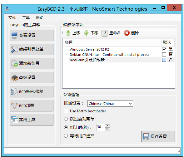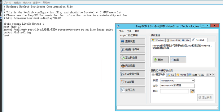 下面打开 EasyBCD,添加一个 NeoGrub 引导项,并进行配置: