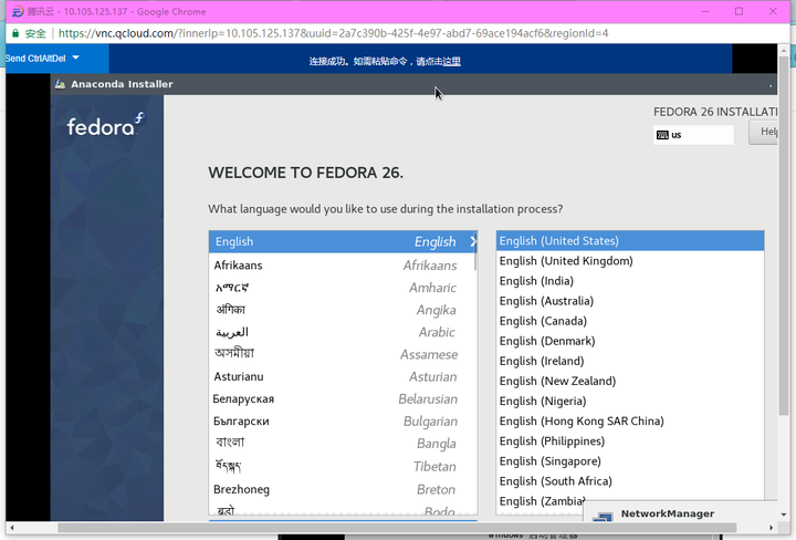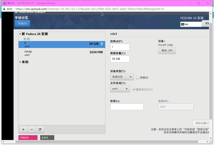 若配置正常即可进入 Fedora 的 LiveCD 环境,点击开始安装即可,注意安装到之前分出的 /dev/vda1 中。