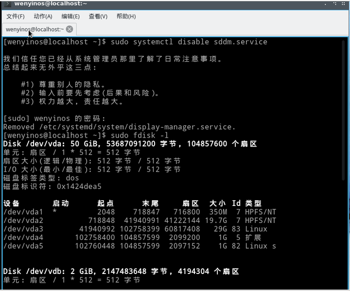 安装完以后重启虚拟机,可以关闭图形界面然后确认一下分区情况,再重新启动。