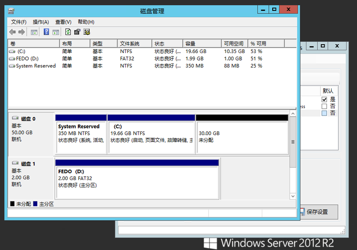 第二步将 Windows 中磁盘 1 压缩出一定空闲空间,个人分配了 30GB,并把磁盘 2 格式化为 FAT32 分区,如图所示:
