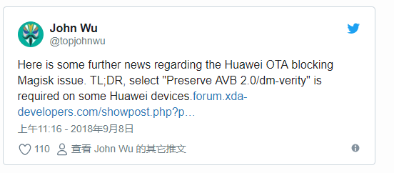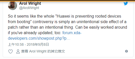 到目前为止,已有几个用户确认此行为。它似乎也不仅限于华为P9,因为华为Mate 10论坛上的用户在安装“patch01”OTA更新后也确认了相同的行为,这使我们认为这个补丁将推广到所有人目前支持华为/ Honor手机。鉴于华为最近关于引导加载程序解锁的行动,不难看出为什么人们认为这个更新被推出以故意阻止root。XDA认可的开发者/认可贡献者topjohnwu是Magisk背后的主要开发者,最初在他的Twitter账户上承认了这个问题。