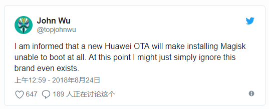 原文:Huawei rolled out an update which broke Magisk, but it can be easily fixed