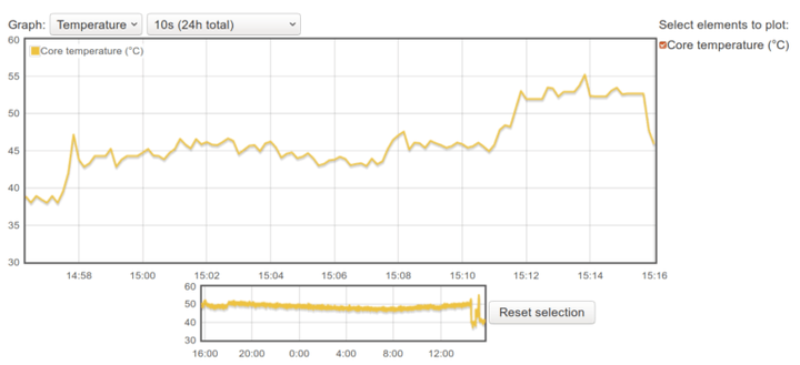 rpi-monitor 的图表中,在 55°C 时显示最高值,但仍与处理器的 85°C 硬件温控限制相差 30°C。